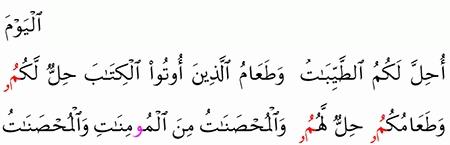 ال ي و م أ ح ل ل ك م الط ي ب ات و ط ع ام ال ذ ين أ وت وا ال ك ت اب ح ل ل ك م و ط ع ام ك م ح ل ل ه م و ال م ح ص ن ات م ن ال م ؤ م ن ات و ال م ح ص ن ات م ن ال ذ ين أ وت وا ال ك ت اب م ن ق ب ل ك م إ ذ ا آت ي ت م وه ن
