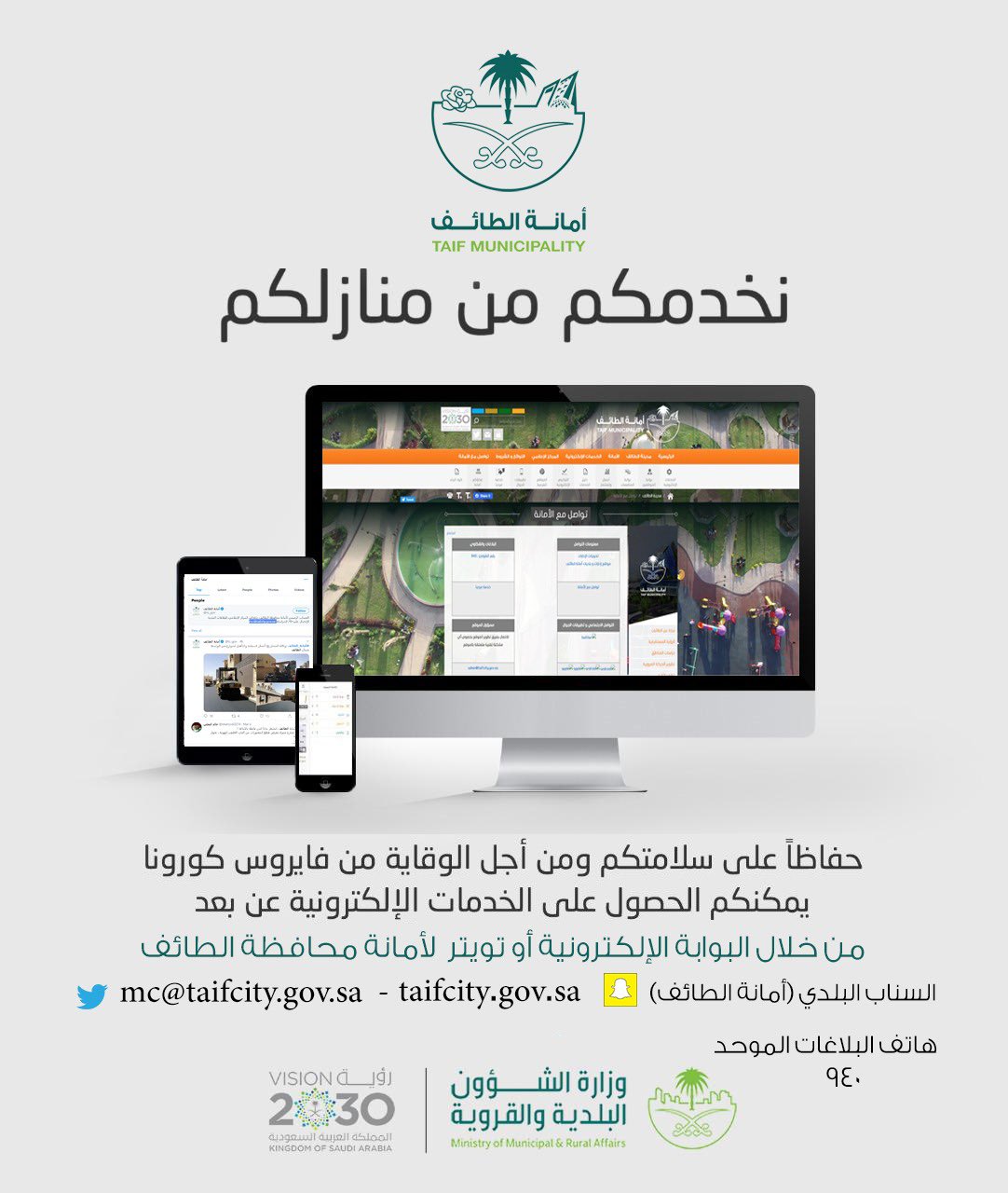 أمانة الطائف Ar Twitter أمانة الطائف نخدمكم من منازلكم حفاطا على سلامتكم ومن أجل الوقاية من فايروس كورونا يمكنكم الحصول على الخدمات الإلكترونية عن بعد Https T Co Vzbwjremty